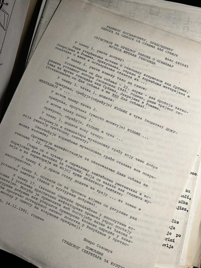Део вредне архивске грађе пристигла је у Музеј жртава геноцида захваљујући поклону који је учинио г. Шпиро Соломун. Више од хиљаду архивских докумената који су уступљени нашем Музеју на старање осветљавају праксе културе сећања током 80-их и 90-их година прошлог века.