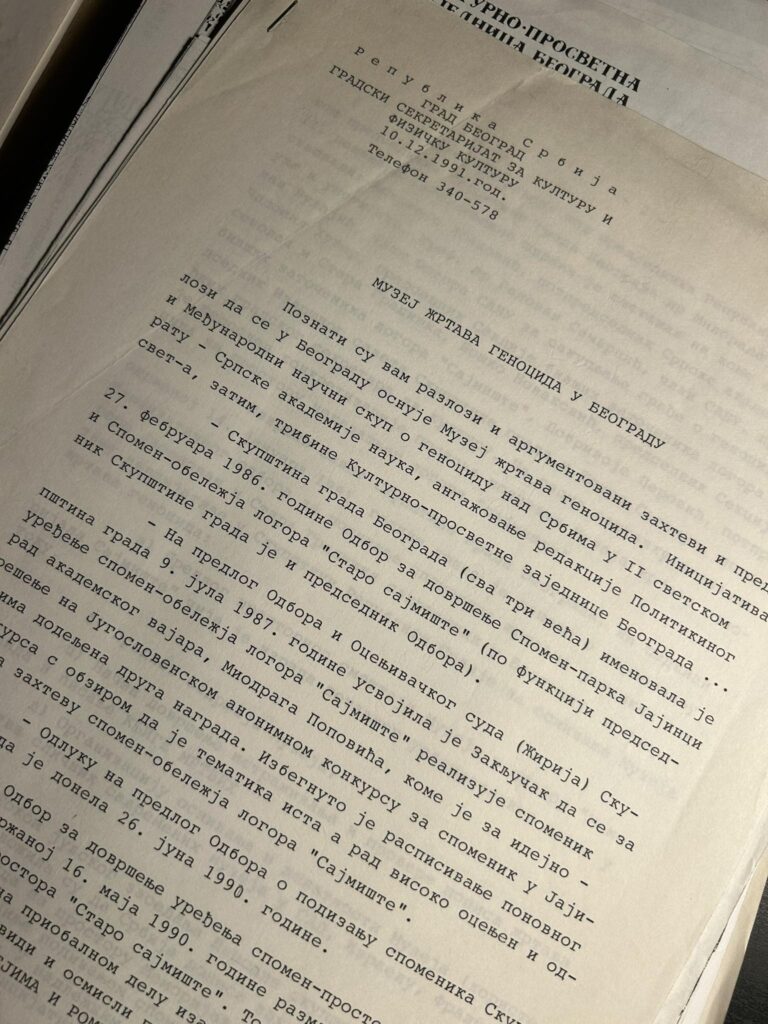 Од изузетног значаја су документи који су у вези са оснивањем Музеја жртава геноцида, уређењем спомен подручја у Јајинцима и на Сајмишту, комеморативни свечностима које су приређиване на поменутим стратиштима, и бројна друга документација која осветљава историјске процесе у последње две деценије двадесетог века, а који су у вези настајања нашег Музеја и формирања културе сећања на невино пострадале претке.